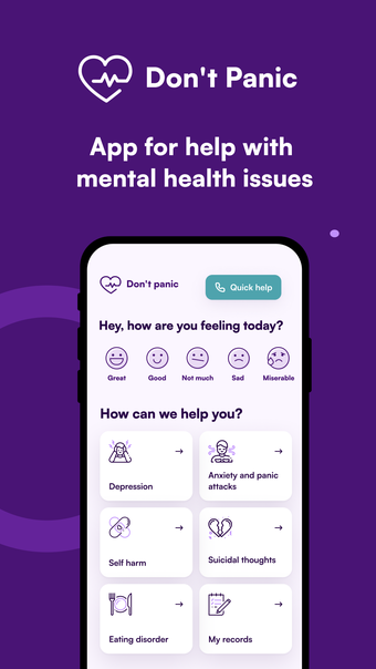 Dont Panic is een gratis iPhone-app die zich richt op het ondersteunen van gebruikers bij het omgaan met geestelijke gezondheidsproblemen zoals depressie, angst en zelfbeschadiging. De app is ingedeeld in vijf modules: depressie, angst en paniekaanvallen, zelfbeschadiging, suïcidale gedachten en professionele hulpbronnen. Elke module biedt specifieke functies om gebruikers te helpen hun emoties te beheren en positieve coping-strategieën te ontwikkelen.